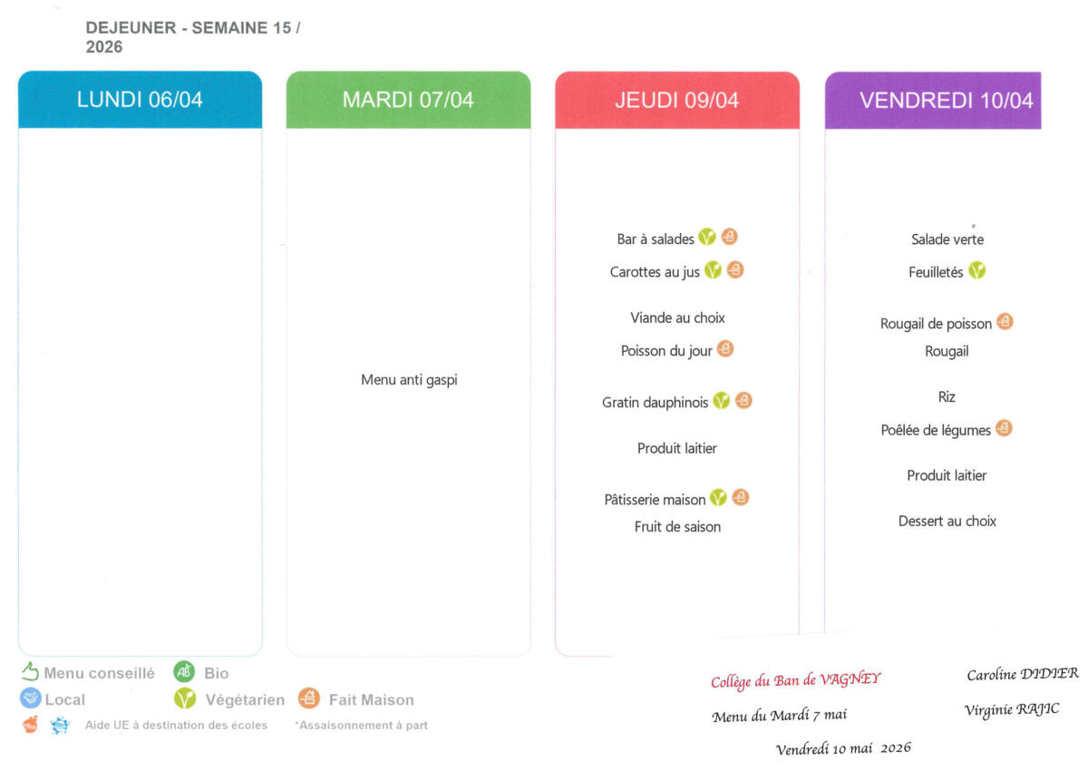 A table ! 🍽️ 04/04/2026 Les menus de la cantine (collège et petits) pour la semaine du 07 au 10 avril. Source : Mairie de Vagney