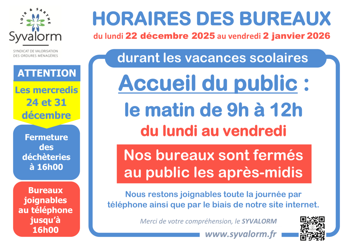 Syvalorm Horaires Des Bureaux Pendant Les Vacances Scolaires 29/12/2025 Bonjour à tous, Voir ci-dessous les horaires des bureaux SYVALORM pendant les vacances scolaires ainsi que les dates de fermeture des déchèteries: les 24 et 31 décembre 2025. Joyeuses fêtes à tous 🍾🎄🎉🎁