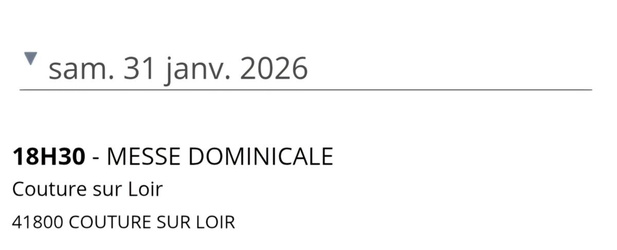 Messes.Info 31/01/2026 Samedi 31 Janvier 2026 à 18h30 Messe dominicale à Couture-sur-Loir Source : Mairie de Vallée de Ronsard