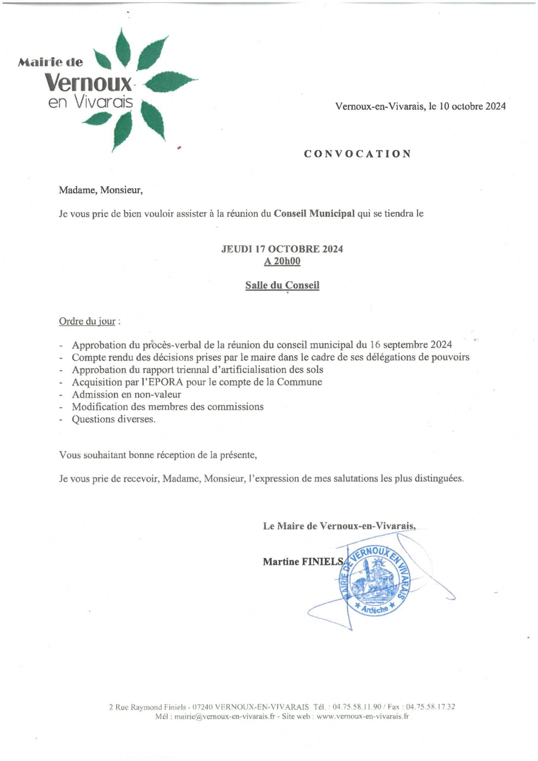 Conseil Municipal Jeudi 17 octobre 20h00 Salle du conseil