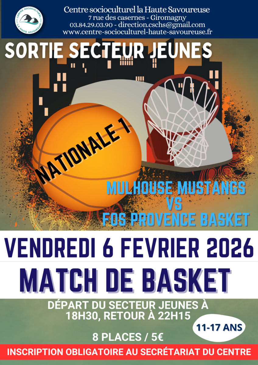 Le secteur jeunes du centre socioculturel t’emmène vivre l’ambiance d’un vrai match de Nationale 1 : Mulhouse Mustangs vs Fos Provence Basket !