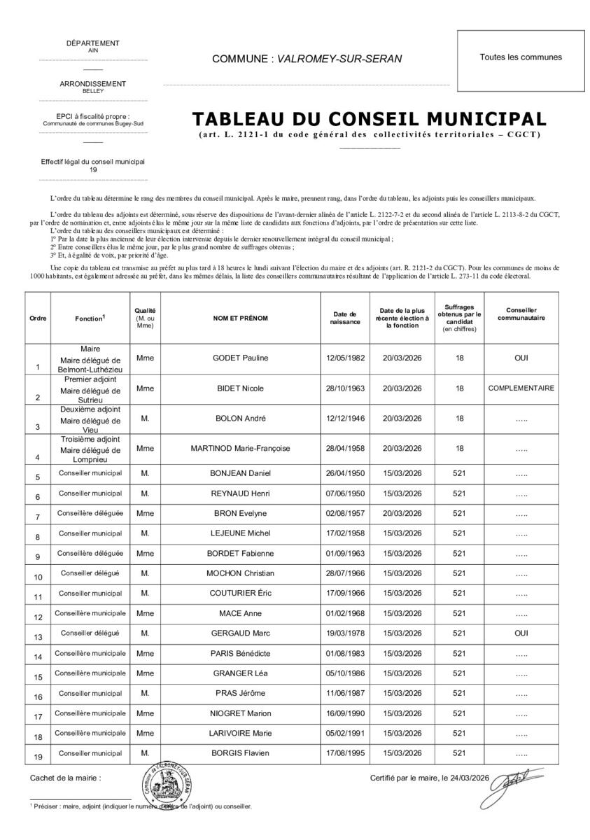 Tableau du conseil municipal 26-03-24 Bonjour, Veuillez trouver ci-dessous le tableau du conseil municipal: