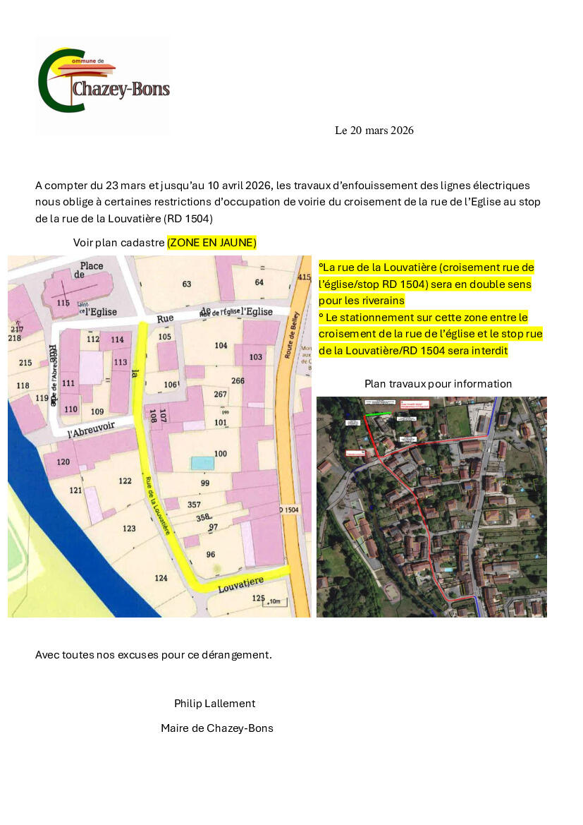A compter du 23 mars et jusqu’au 10 avril 2026, les travaux d’enfouissement des lignes électriques nous oblige à certaines restrictions d’occupation de voirie du croisement de la rue de l’Eglise au stop de la rue de la Louvatière (RD 1504)