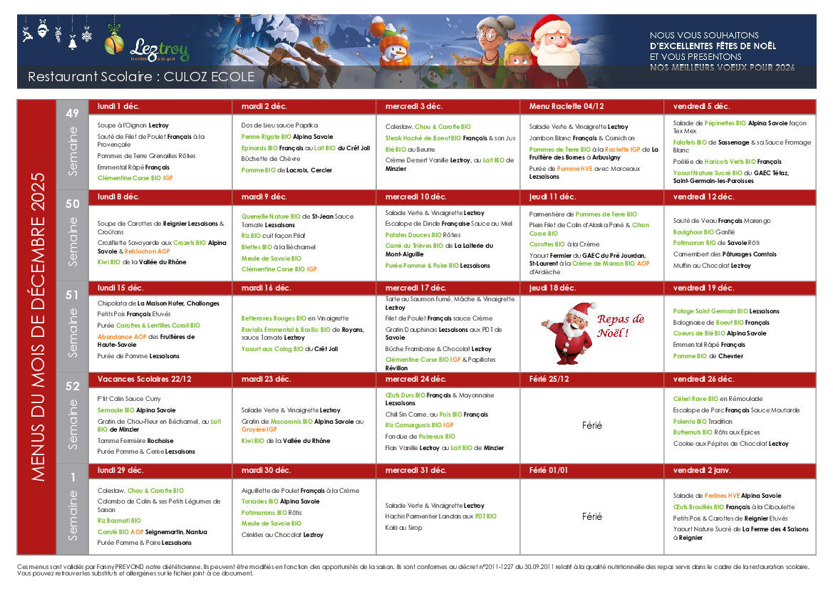 Menu cantine décembre 2025