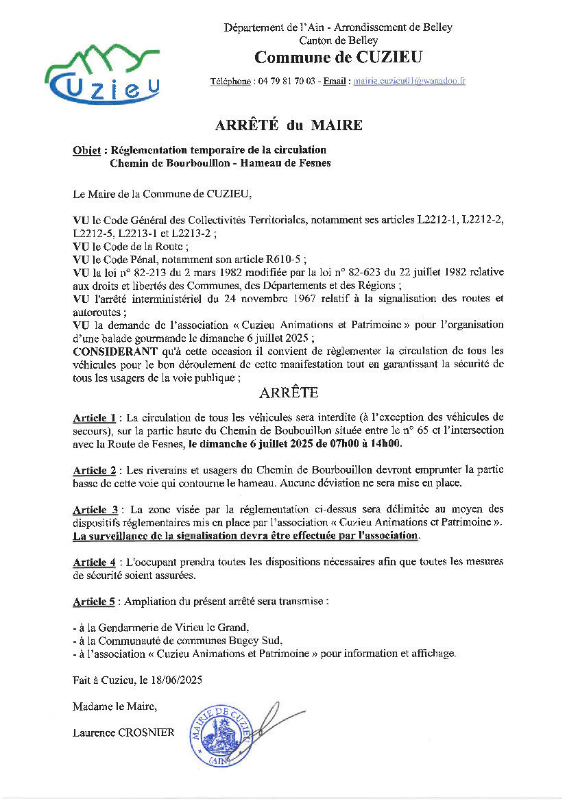 Dans le cadre de la balade gourmande qui aura lieu ce dimanche 06 juillet au matin et à la demande de l'association "Cuzieu Animation & Patrimoine", la circulation sera interdite devant le four de Fesnes (entre le n° 65 du Chemin de Bourbouillon et l'intersection avec la Route de Fesnes) de 07h00 à 14h00.