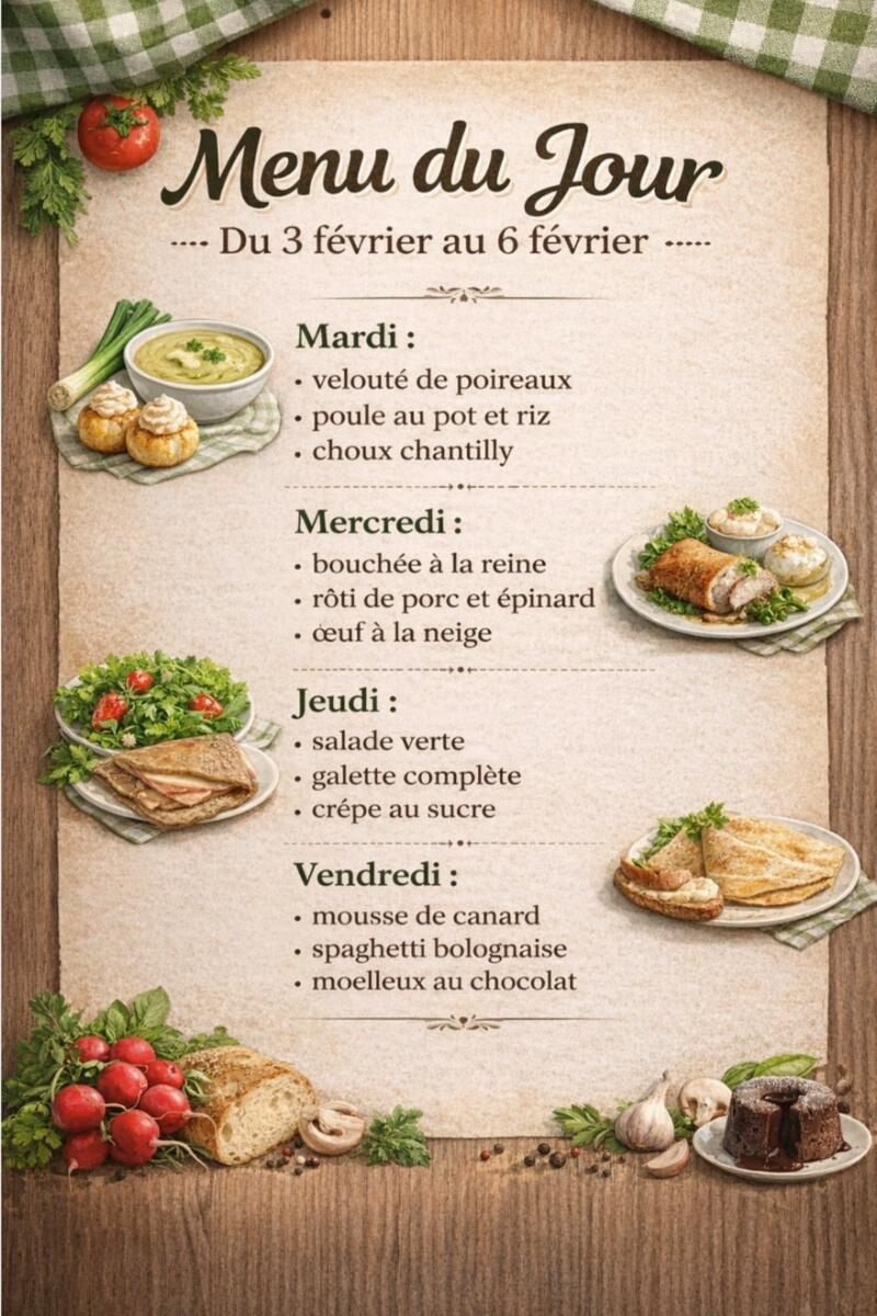 Voici les menus du jour de la semaine prochaine.