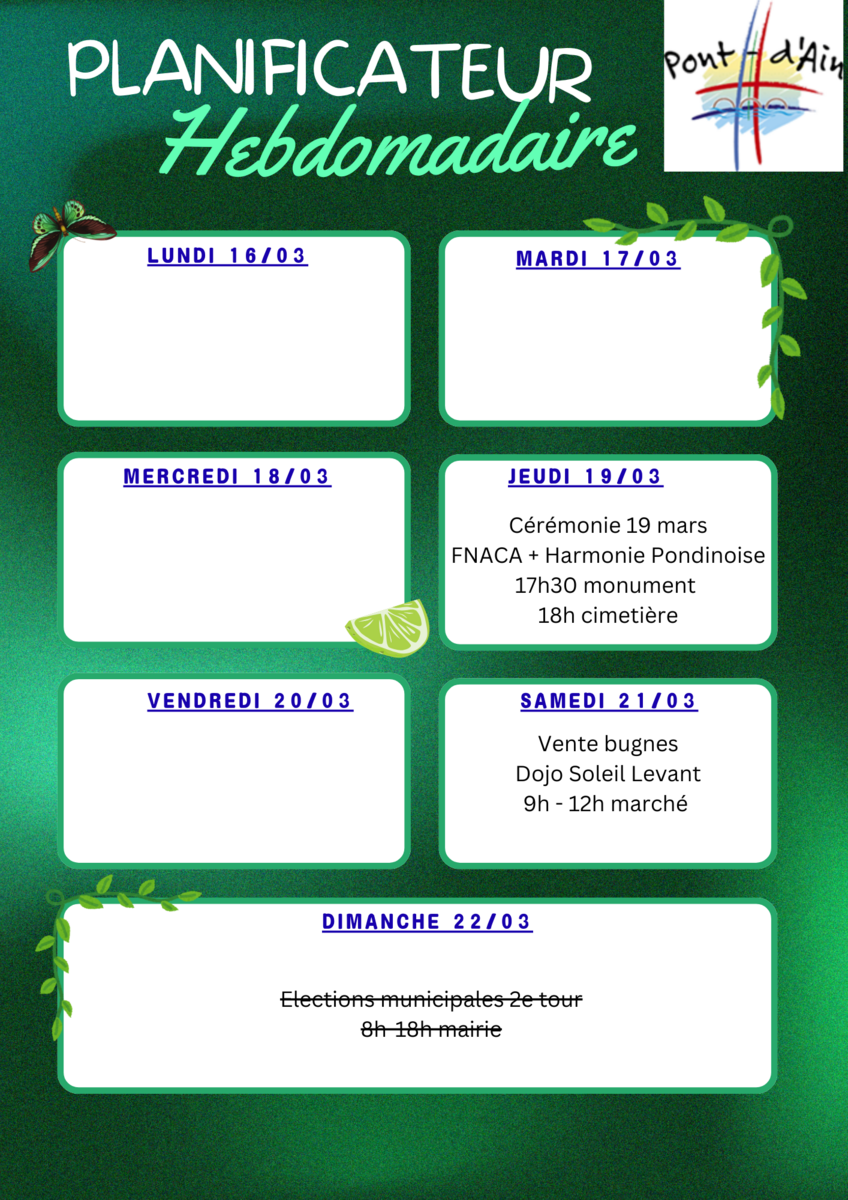 Voici votre agenda pour les deux prochaines semaines #Agenda2026 #electionsmunicipales2026 #AssociationsLocales #ceremonie #icicestpontdain