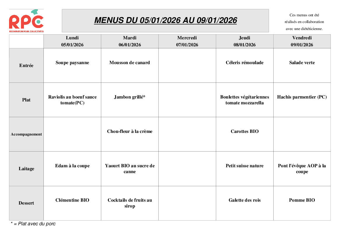 MENU CANTINE ECOLE HEYRIAT DU 05 AU 09 JANVIER