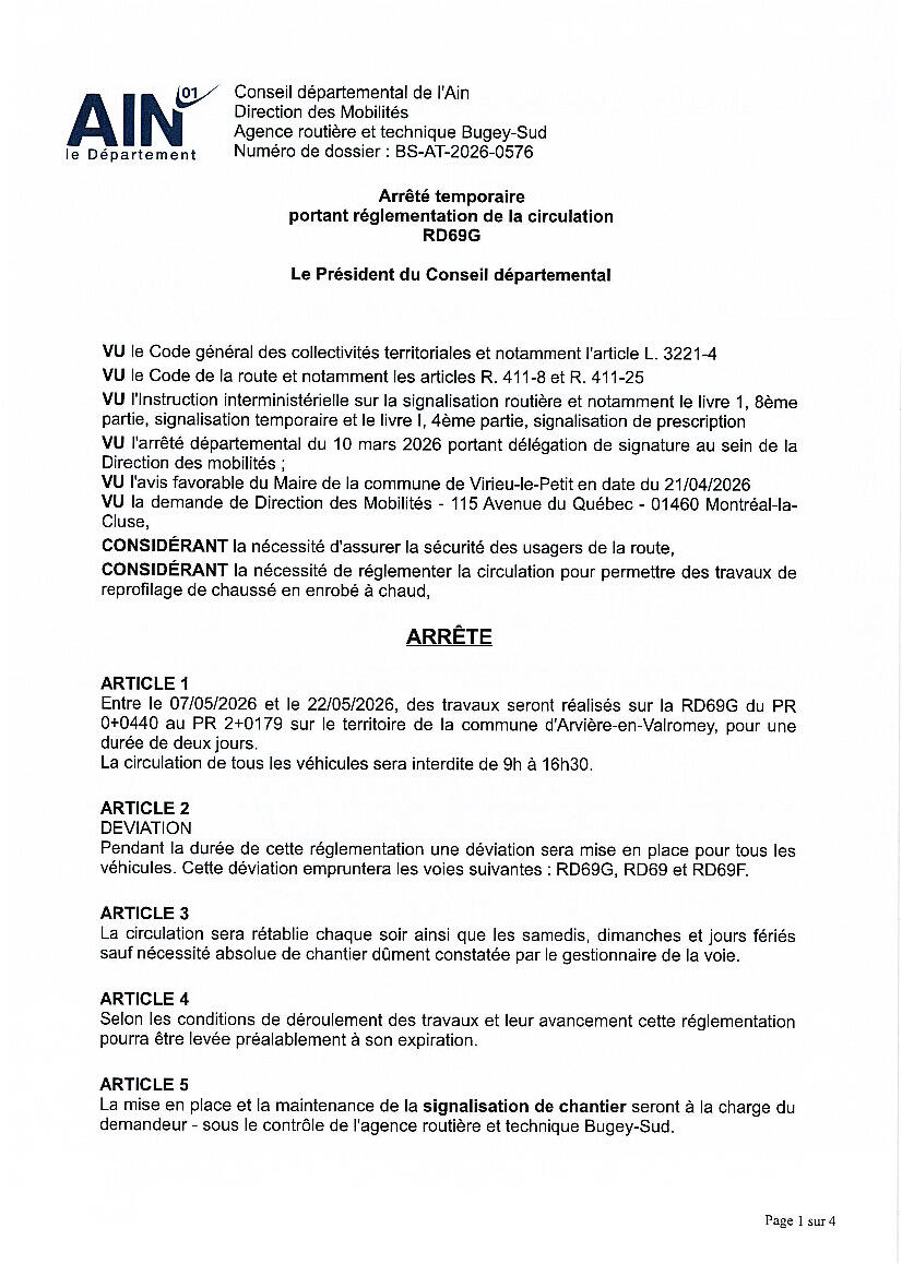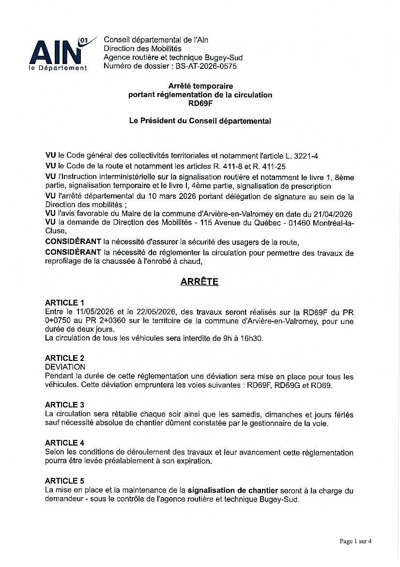 Travaux, arrêté de circulation - Arvière-en-Valromey