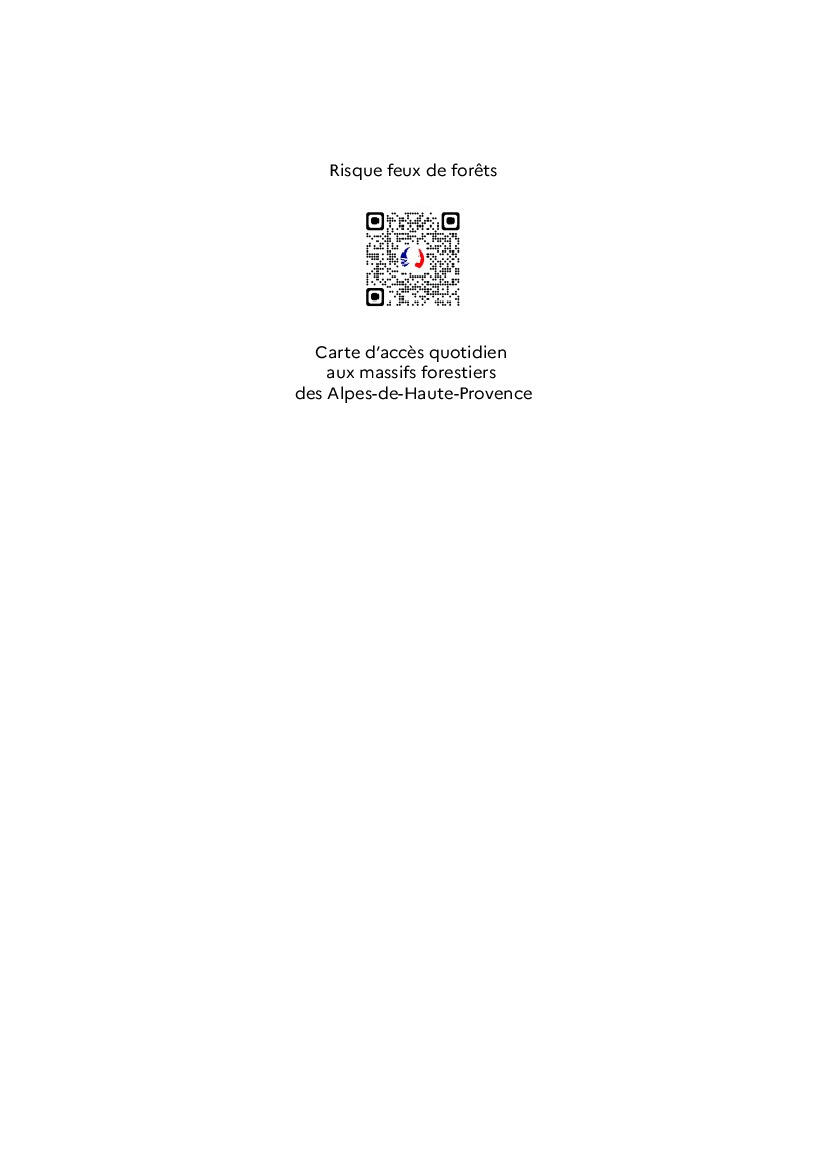 L'arrêté, la plaquette, le QR CODE et l'accès à la carte se font aussi ici: https://www.alpes-de-haute-provence.gouv.fr/Actions-de-l-Etat/Environnement-risques-naturels-et-technologiques/Defense-des-Forets-Contre-l-Incendie-DFCI/Acces-aux-massifs-forestiers-en-periode-a-risque