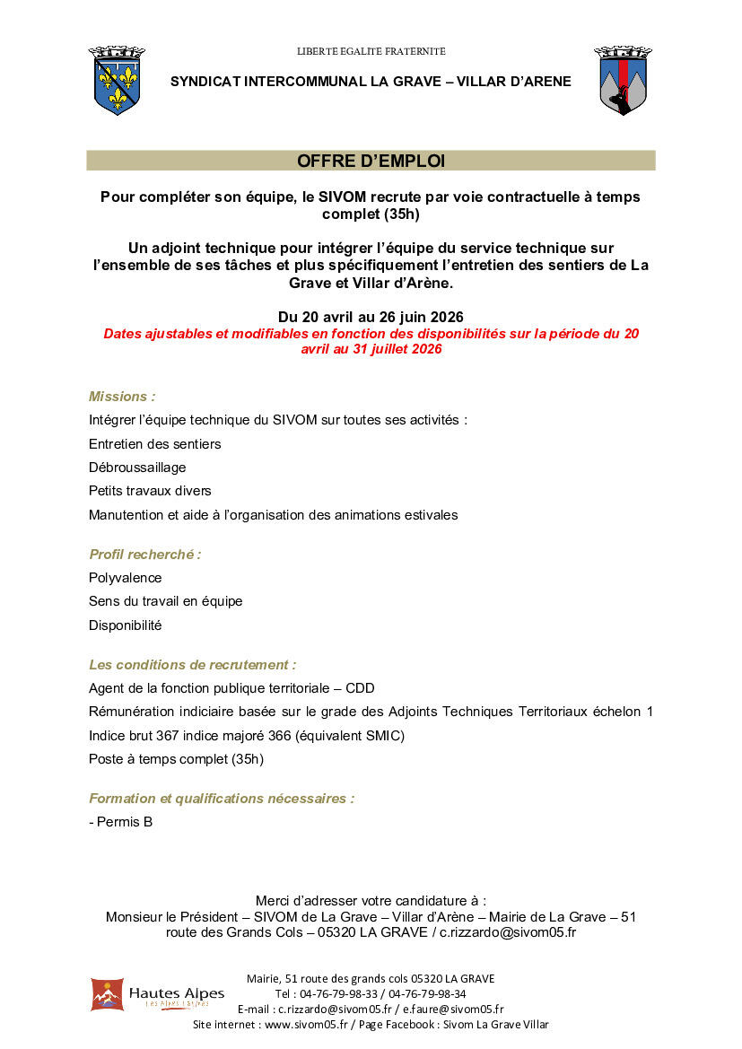 OFFRE D'EMPLOI 26-04-20 Le SIVOM recrute un adjoint technique du 20 avril au 26 juin 2026. Source : Mairie de Villar-D'Arène