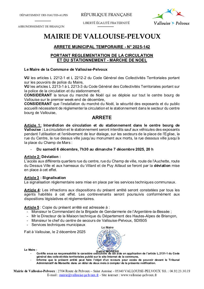 La circulation et le stationnement sont interdits dans le centre bourg de Vallouise, place de l'église, ce week-end en raison de l'installation du marché de Noël, samedi 6 et dimanche 7 déc.