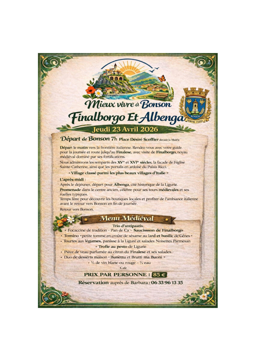 Sortie organisée à Finalborgo et Albenga 26-03-07 Organisé par l'association "Mieux vivre à Bonson" Le jeudi 23 avril 2026