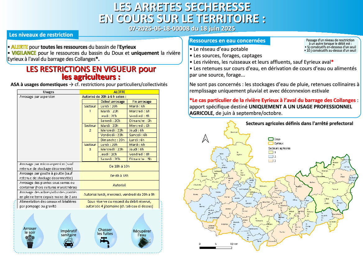 Malgré un printemps pluvieux, la Préfecture de l'Ardèche a classé au niveau ALERTE pour toutes les ressources le bassin de l'Eyrieux, en raison de la baisse du débit des rivières. Le bassin du Doux est en VIGILANCE. Nous sommes tous invités à réduire autant que possible nos consommations.