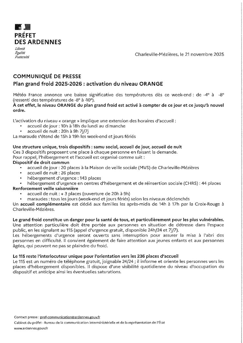 Nous informons la population que le Plan Grand Froid – niveau ORANGE est désormais activé en raison des températures particulièrement basses annoncées dans les prochains jours.