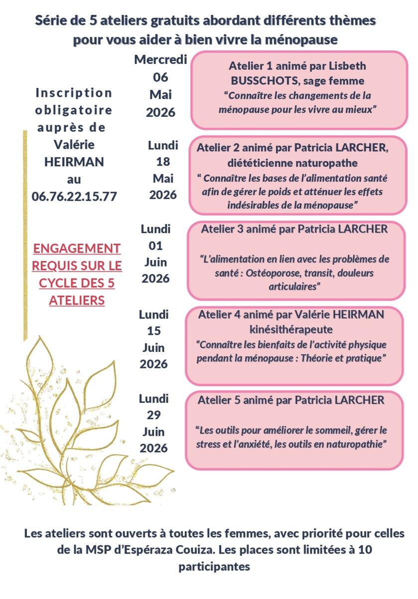 Ces ateliers sont proposés prioritairement aux femmes ménopausées ou non, suivies par un professionnel de santé de la Msp Esperaza Couiza
