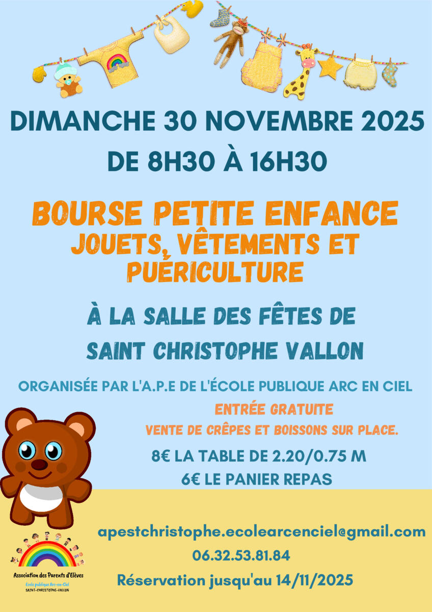 L’Association des Parents d’Élèves de l’école publique Arc-en-Ciel organise une Bourse Petite Enfance le dimanche 30 novembre, à la salle des fêtes de Saint-Christophe-Vallon.