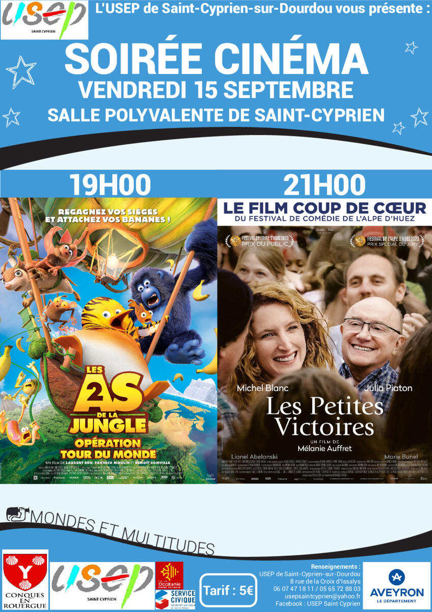 L'Usep organise une soirée cinéma avec 2 films le vendredi 15 Septembre à 19h00 et 21h00,salle polyvalente de Saint-(Cyprien.