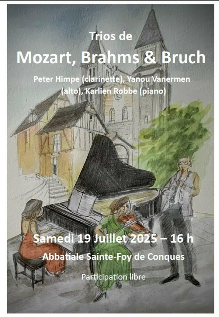 Le samedi 19 juillet à 16h, l'abbatiale de Conques accueillera un concert de musique de chambre dans le bras nord du transept, au pied du haut-relief de l'Annonciation. Le clarinettiste Peter Himpe, l'altiste Yanou Vanermen ainsi que Karlien Robbe au piano interprèteront les trios des compositeurs Wolfgang Amadeus Mozart, Johannes Brahms et Max Bruch. Ce concert nous permettra de découvrir des œuvres qui ne sont pas jouées fréquemment, alors qu'elles en valent la peine. L'entrée sera libre, une collecte pour le soutien des artistes et pour la réfection de l'orgue sera proposée à la sortie de l'église.