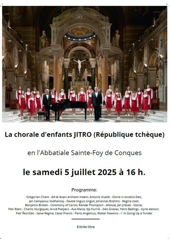 L'abbatiale de Conques accueillera à nouveau le chœur d'enfants tchèque "Jitro". Il y a déjà deux ans, ces jeunes artistes nous avaient déjà grandement réjouis et nous sommes heureux de pouvoir les accueillir à nouveau. Dans l'abbatiale de Conques, ils feront résonner l'acoustique avec des œuvres sacrées. Ce concert aura lieu le samedi 5 juillet à 16h. L'entrée est libre, un chapeau sera placé à la sortie pour soutenir le travail du chœur ainsi que la restauration du grand orgue de l'abbatiale.