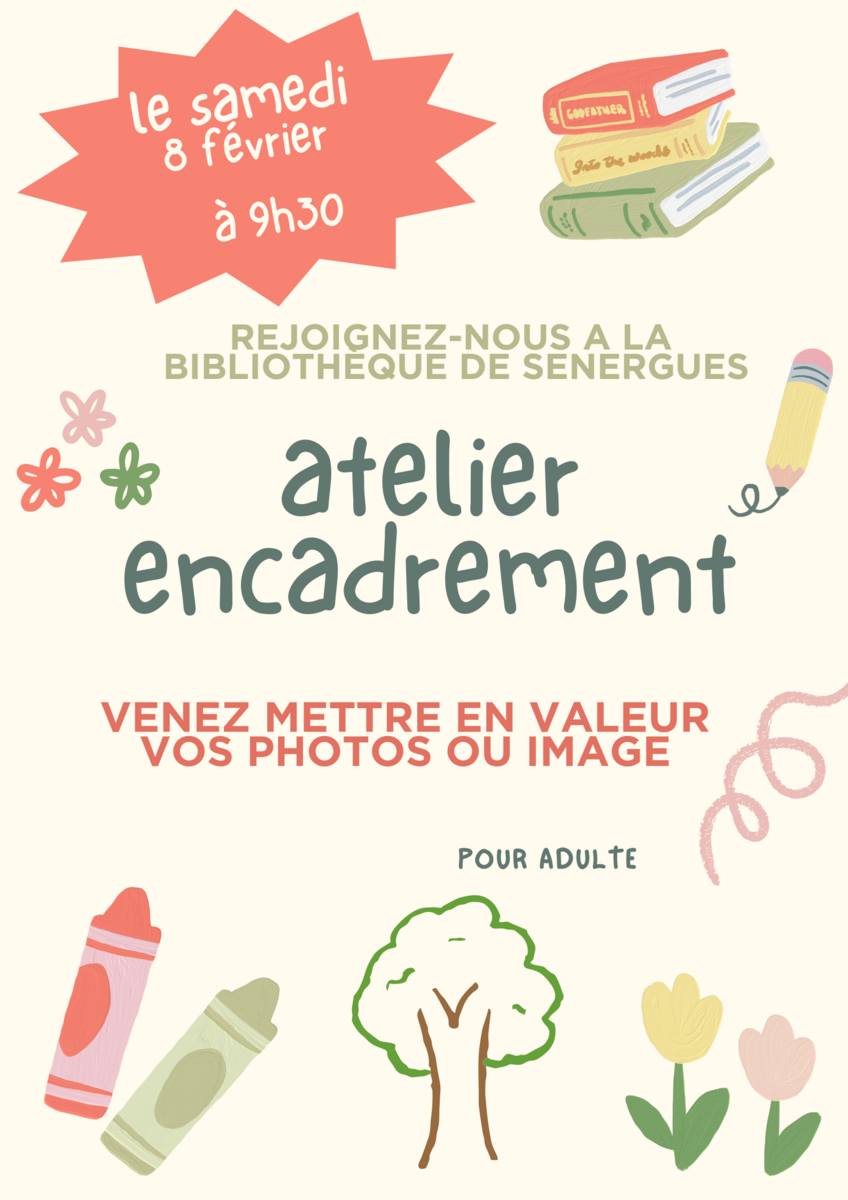 Samedi 8 février de 9 h 30 à 12 heures, les bénévoles de la bibliothèque vous convient à un atelier encadrement animé par Marie-Christine et Martine.