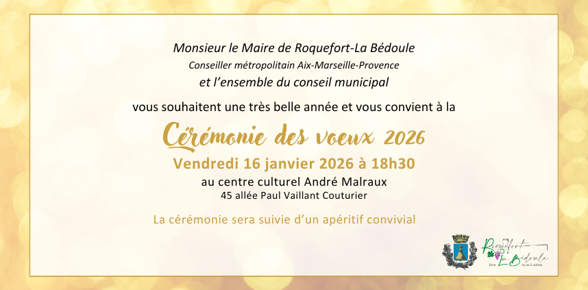 Monsieur le Maire et le conseil municipal vous convient à la traditionnelle cérémonie des vœux pour l'année 2026, ce vendredi 16 janvier à 18h30 au centre culturel André Malraux.