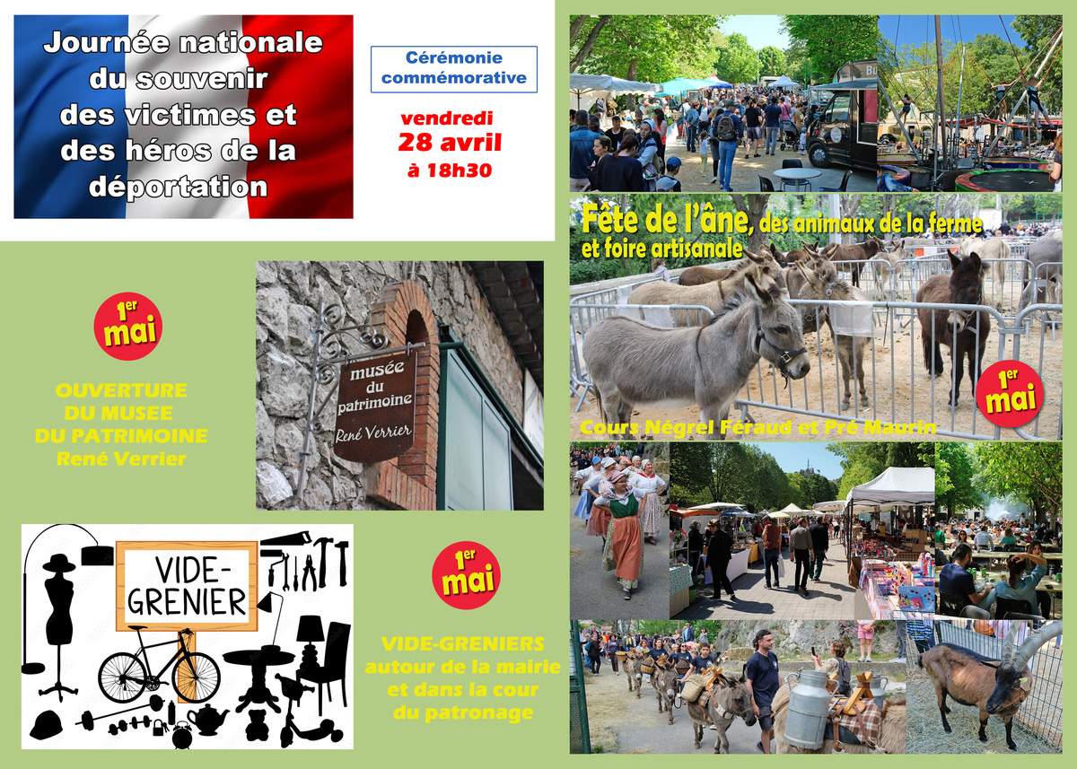 Vendredi 28 avril à 18h30 : cérémonie commémorative en souvenir des Victimes de la déportation. Dépôt de gerbes au Monument aux Morts du Square de Verdun, suivi d’un apéritif servi en mairie.