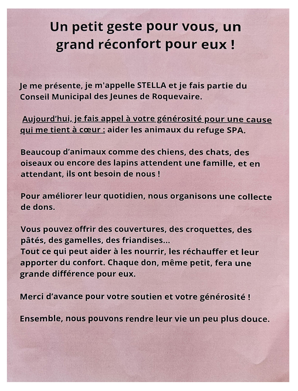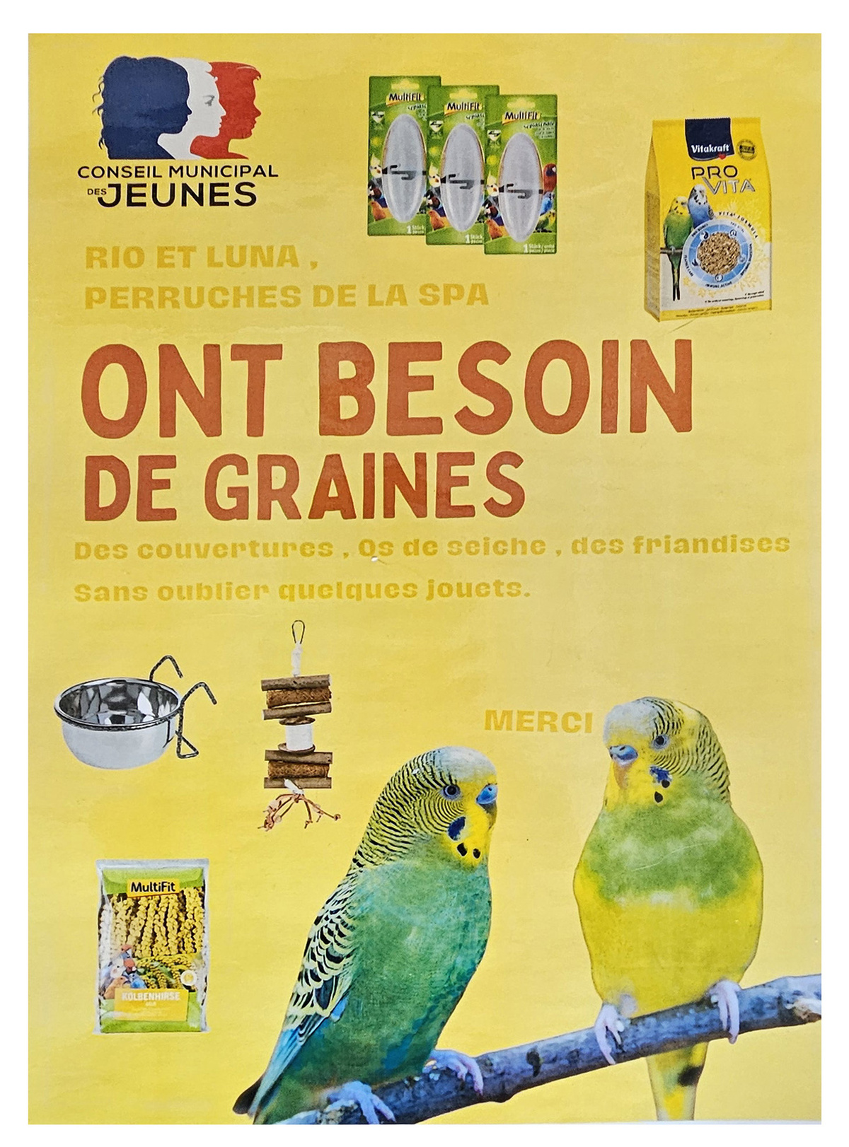 A l'initiative des élus du Conseil Municipal des Jeunes, une grande collecte à destination des animaux est prévue dans toutes les écoles de la commune et le collège Louis Aragon.🐦
