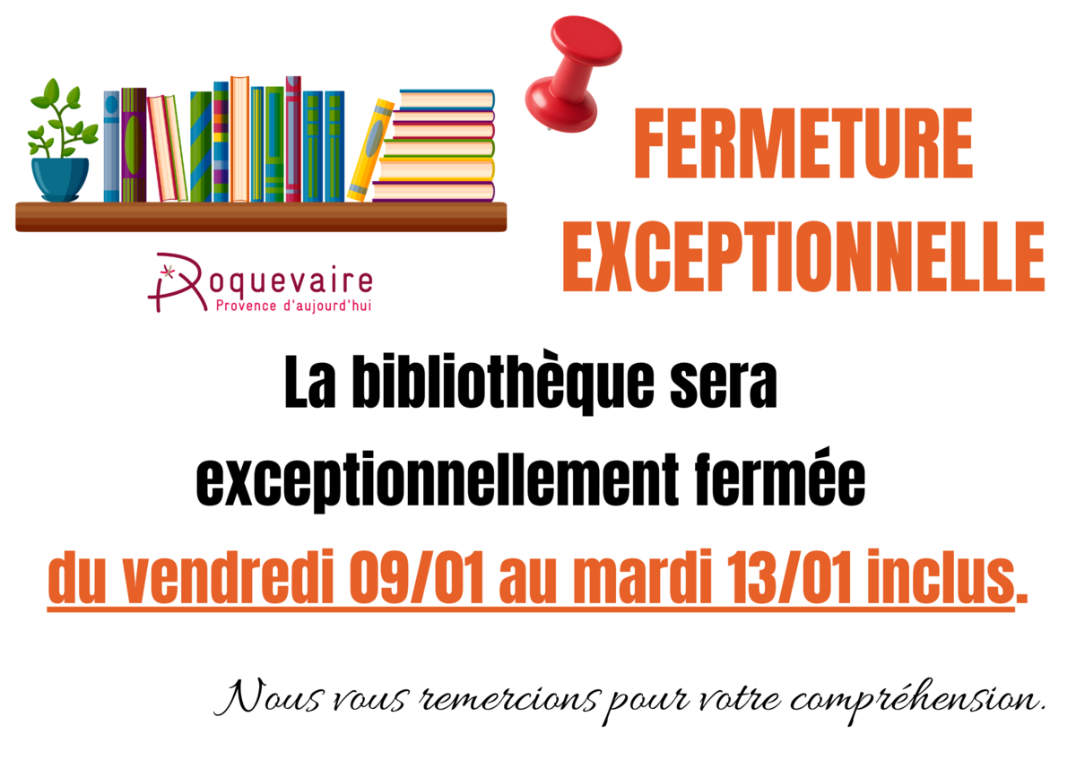 Nous vous informons que la bibliothèque Victor Gélu sera exceptionnellement fermée du vendredi 09 au mardi 13 janvier inclus. Réouverture mercredi 14 janvier, de 9h30 à 12h et de 14h00 à 19h.