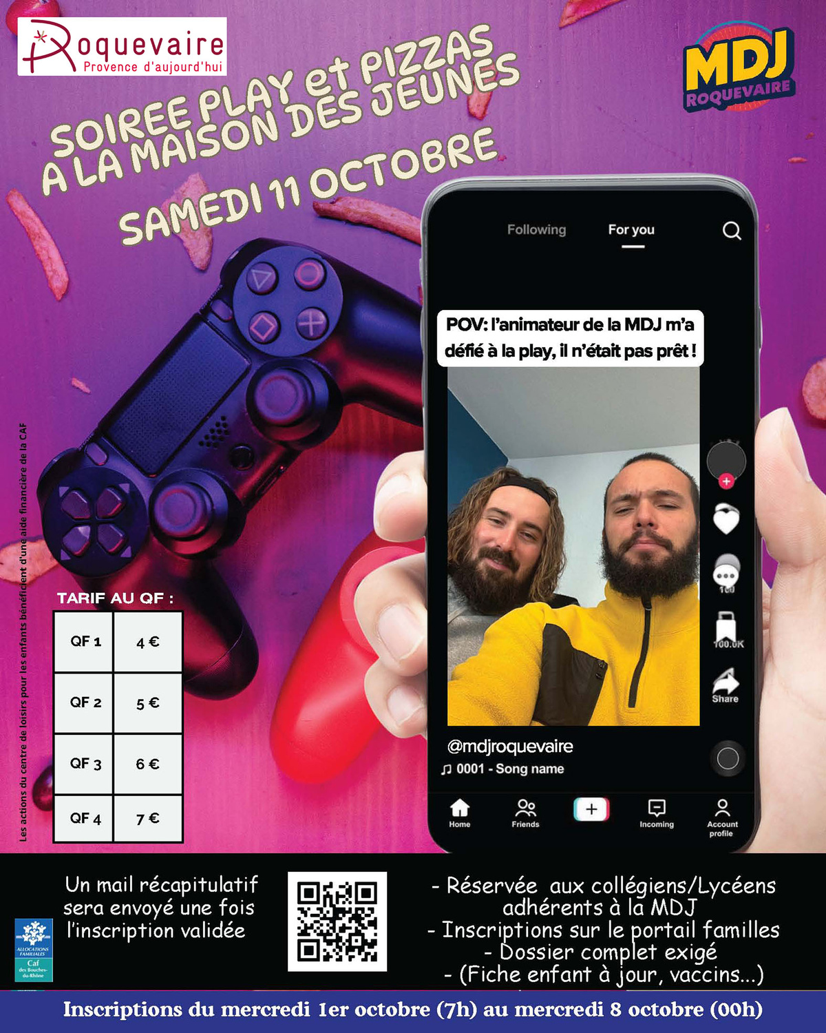 La Maison des Jeunes organise une soirée Play et Pizzas le samedi 11 octobre 2025, encadrée par deux animateurs diplômés, réservée aux collégiens et lycéens adhérents à la MDJ. 👉 Tarif selon quotient familial. 👉 Inscription via le Portail Familles du mercredi 1er octobre à 7h au mercredi 8 octobre à 00h.