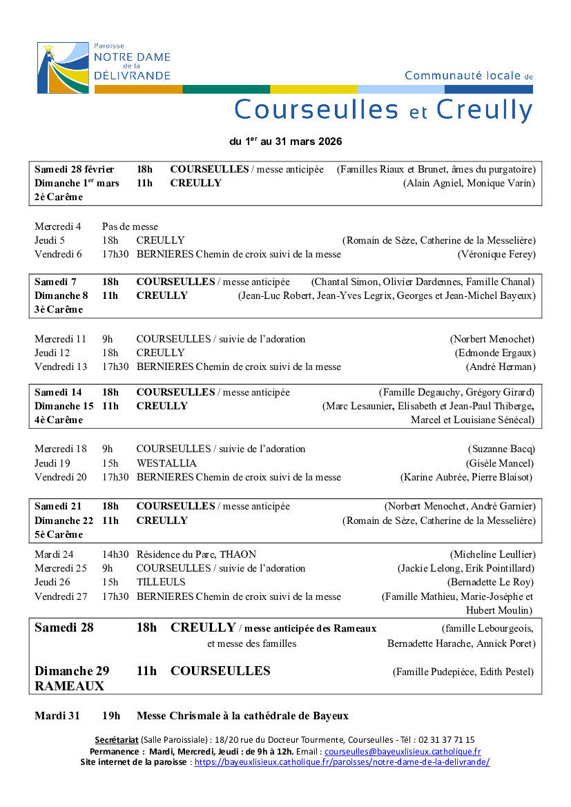 - La messe des Rameaux sera le samedi 28 à 18h à CREULLY