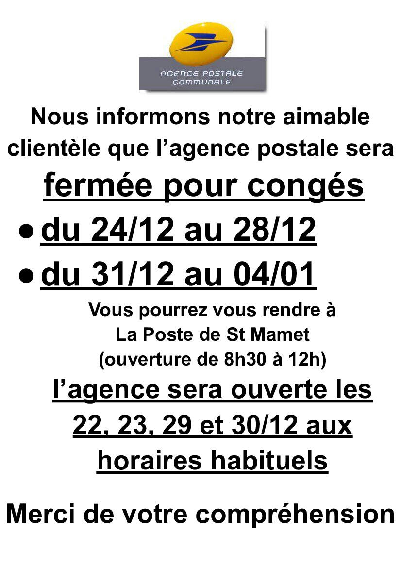 En raison des congés, l'agence postale sera ouverte uniquement les 22, 23, 29 et 30 décembre aux horaires habituels quant au secrétariat de mairie, il sera fermé du 22 décembre au 04 janvier. Vous remerciant pour votre compréhension. Nous vous souhaitons de belles fêtes de fin d'année.