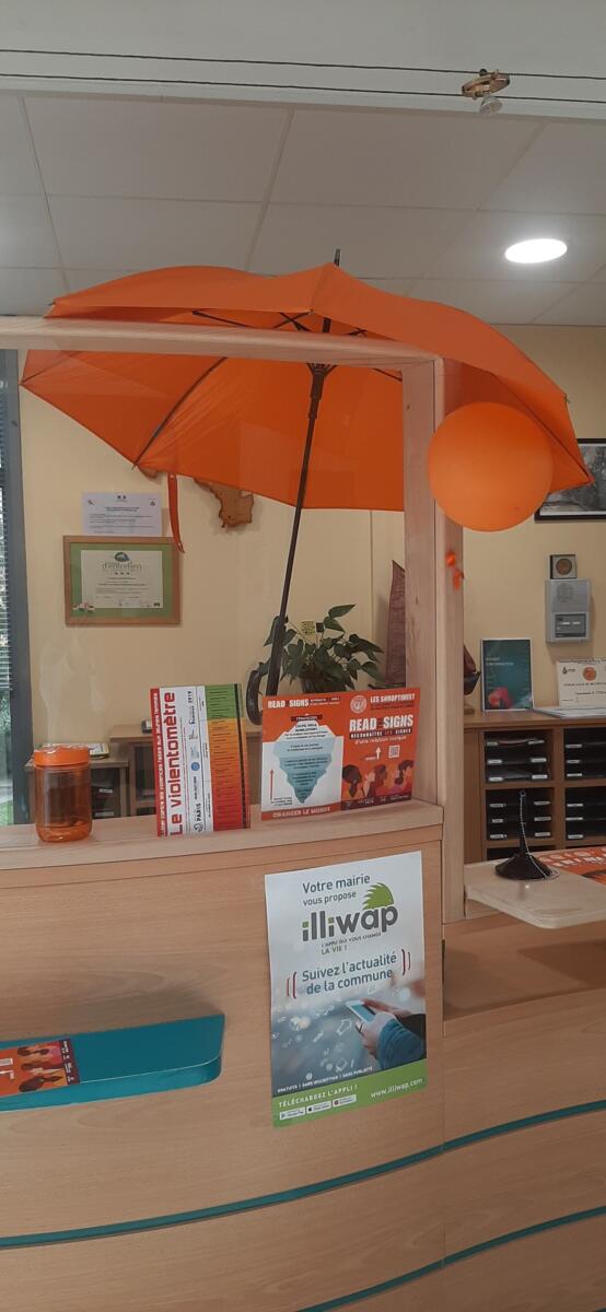 Agents municipaux et รฉlu(es), ensemble pour habiller la Mairie d'Ytrac en orange en รฉcho et solidaritรฉ avec les actions du Soroptimist International Aurillac pour dire STOP ร la violence faite aux femmes !