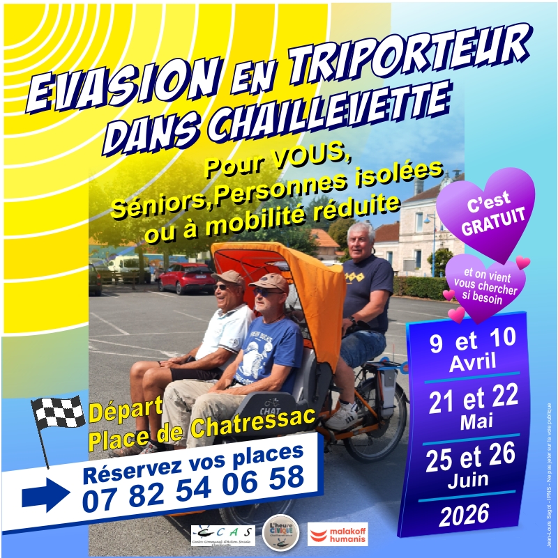 PAvec le printemps, les balades en triporteur pour nos ainés reprennent.Venez nous rejoindre ! Vous pouvez nous accompagner à vélo si vous le souhaitez. Contactez l' Heure Civique de Chaillevette.