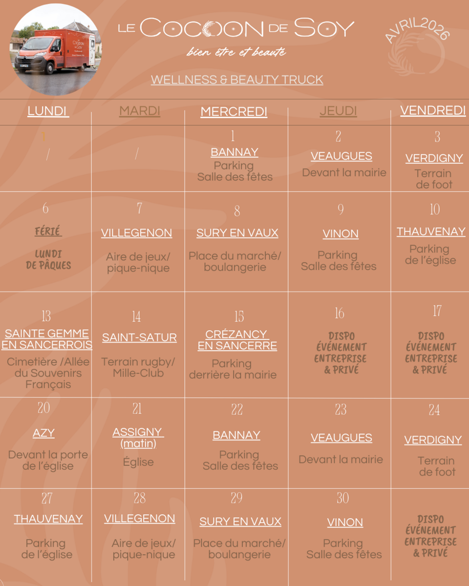 Le Beauty truck "le Cocoon de Soy" sera sur Verdigny les vendredis 3 et 24 avril.