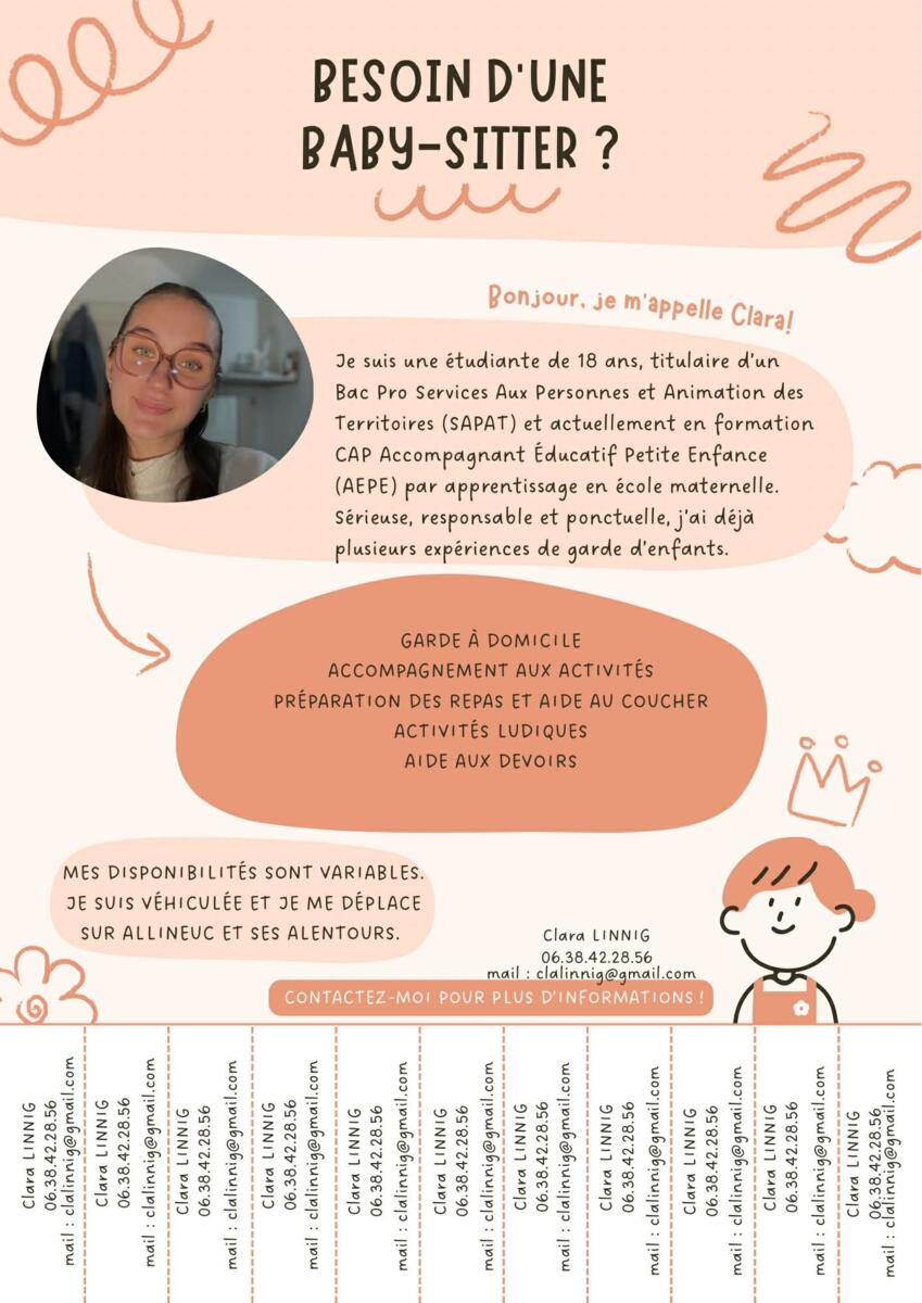 Clara propose ses services de garde d'enfants (simple garde, accompagnement aux activités, préparation des repas et aide au coucher, activités ludiques et aide aux devoirs) pour vos bouts de chou sur Allineuc et alentours.