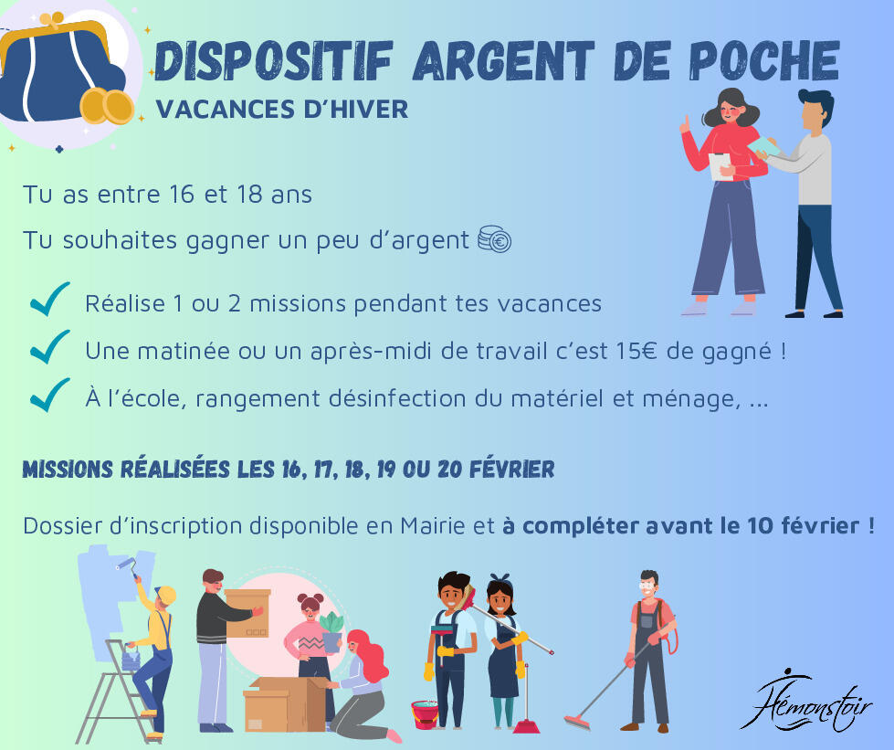 La municipalité reconduit le dispositif "Argent de Poche" pour les vacances d'hiver. Réservé aux jeunes habitants de la commune âgés de 16 à 18 ans.