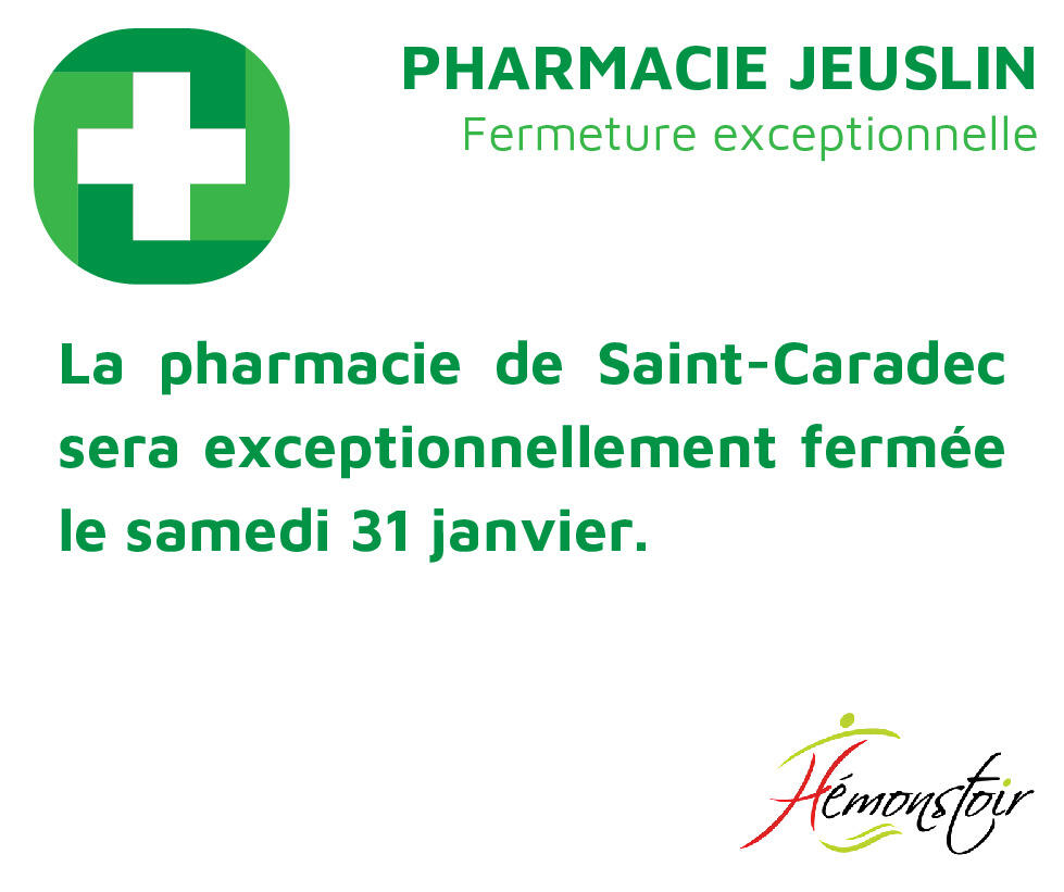 đFERMETURE DE LA PHARMACIE âą 31 JANVIER 26-01-28 La pharmacie de Saint-Caradec sera fermĂ©e le samedi 31 janvier.