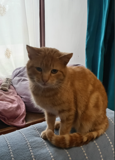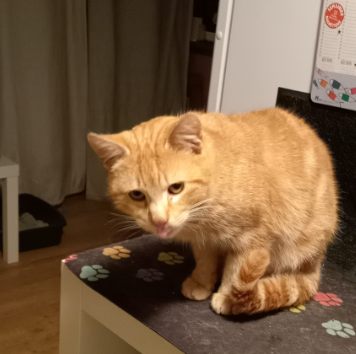 C'est un jeune mâle roux clair, avec un menton blanc. Sur ses cuisses le motif forme un rond. Sa langue n'est jamais complètement rentrée. Il se laisse approcher mais pas soulever.