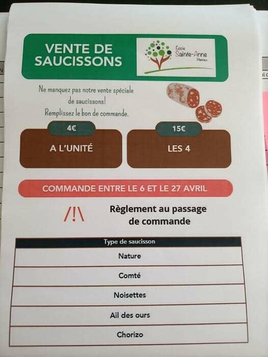 > Commandez dès à présent vos saucissons auprès des élèves de l'école ou en envoyant un message sur la page Facebook de l'école : https://www.facebook.com/sainteanneplumieux