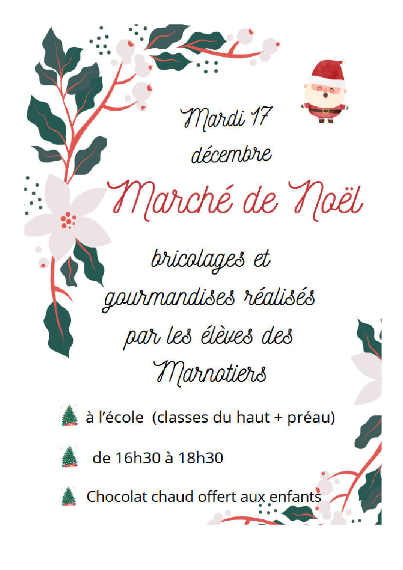L'école des Marnotiers organise mardi 17 décembre de 16h30 à 18h30 leur traditionnel marché de Noël dans l'enceinte de l'école.