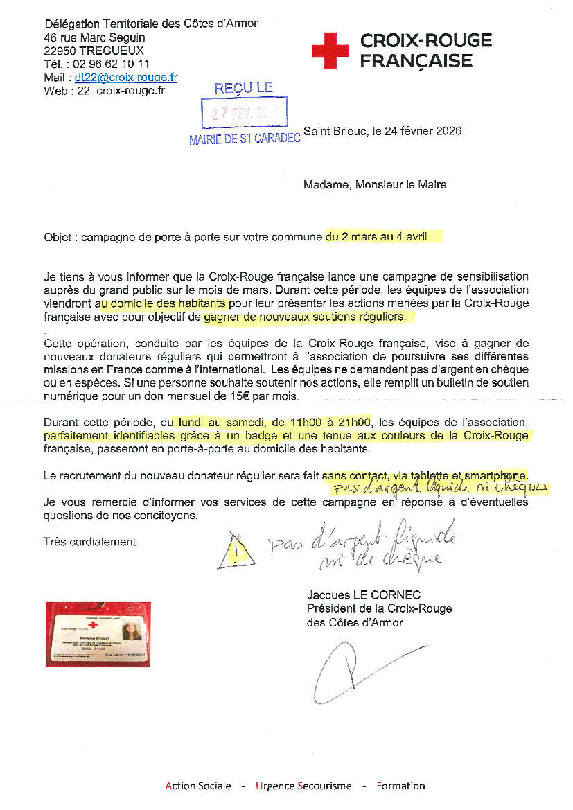 Campagne de collecte de la Croix Rouge du 2 mars au 4 avril en porte à porte afin de rechercher de nouveaux donateurs.