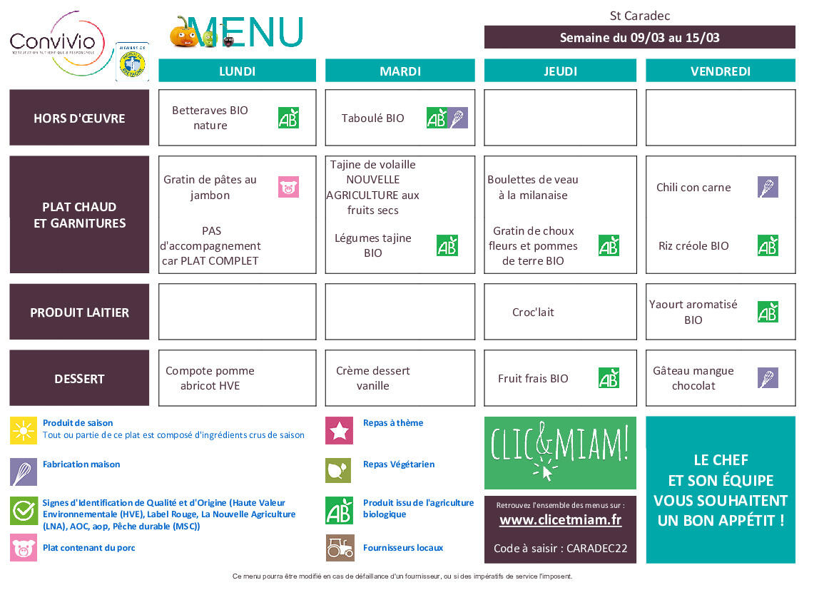 Menu cantine du 9 au 13 mars.
