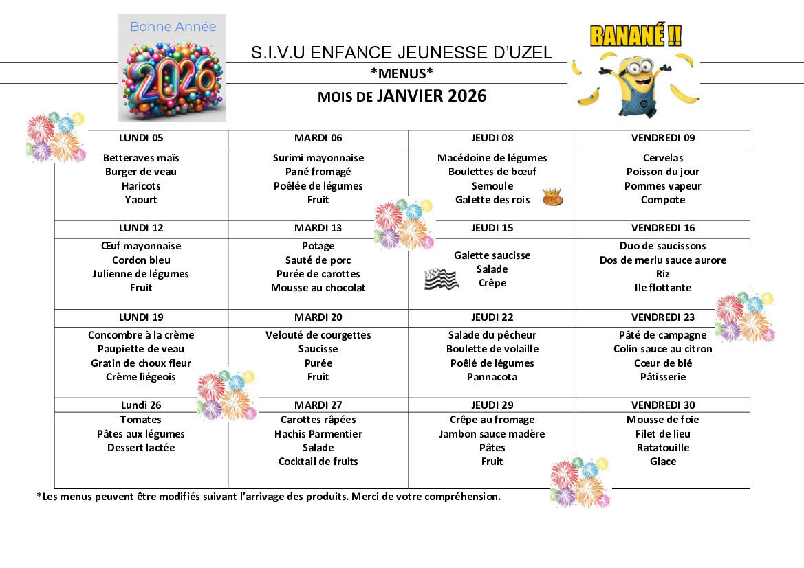 MENUS DU MOIS DE JANVIER 2026