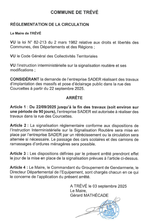 ARRETE TRAVAUX SADER Rue des Courcettes 22/09