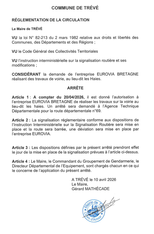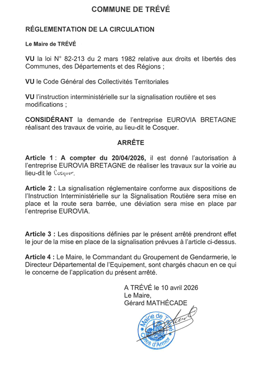 Arrêtés routes Le Cosquer et les haies le 20 avril 2026