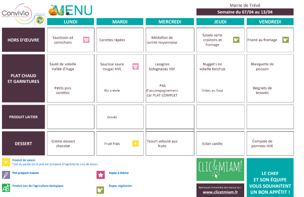 / Menu Cantine Trévé : semaine du 07 au 11 avril