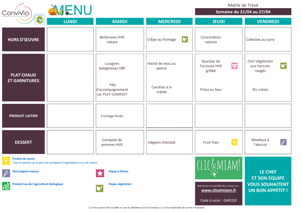 / Menu Cantine Trévé : semaine du 22 au 25 avril