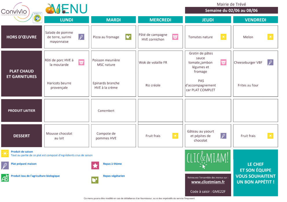 / Menu Cantine Trévé : semaine du 02 au 06 juin