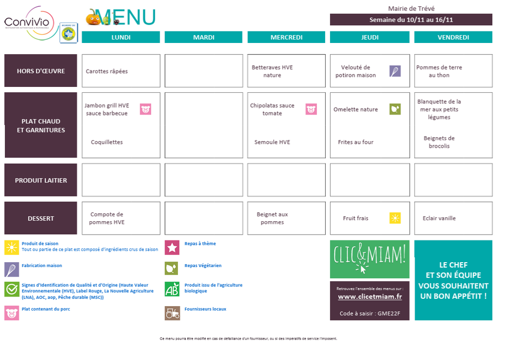 / Menu Cantine Trévé : semaine du 10 au 14 novembre